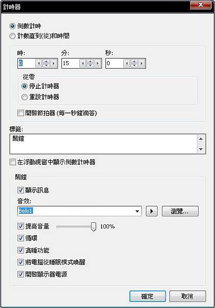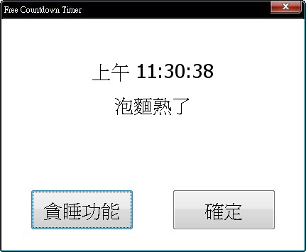 計時器響時除了會有鈴聲外,會跳出這個視窗,按一下【貪睡功能】,會隔一段時間再響起。(如下圖)