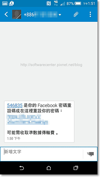 手機順利收到Facebook發送來的簡訊,記住6位數安全驗證碼